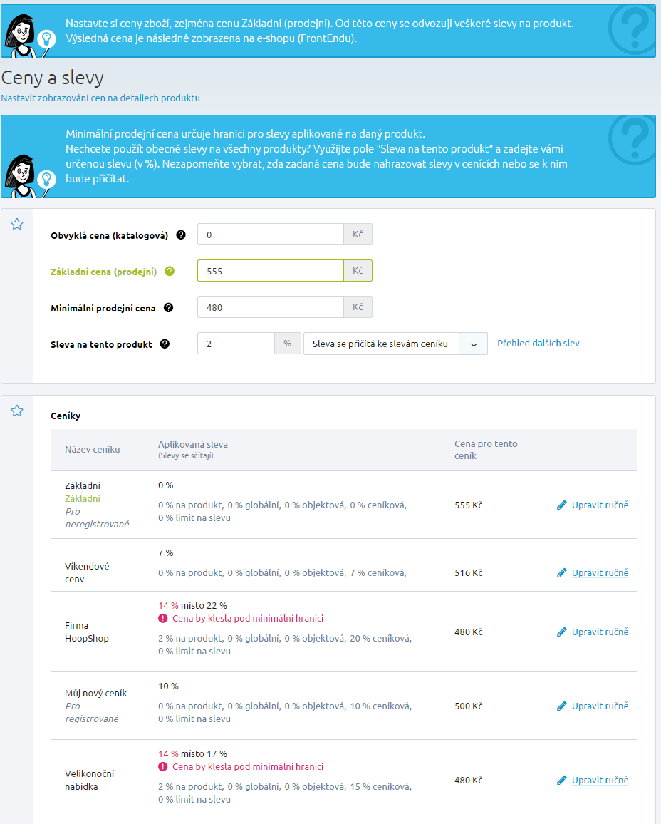 Minimální cena ovlivňuje ceníky a u každého ceníku je zvýrazněná informace o tom, že daný ceník by překročil stanovenou peněžní hranici. Ani při ruční úpravě ceny cena neklesne pod minimální hranici.