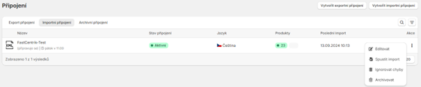 Po založení připojení můžete import spustit kliknutím na tři tečky. Produkty, které se naimportují, se