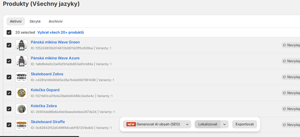 Po vybrání produktů si můžete zvolit, zda chcete vygenerovat AI obsah, poslat je k překladu, případně je