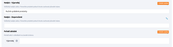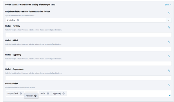 Nastavení příznakových sekcí (Novinky, Doporučené, Výprodej, Akční)