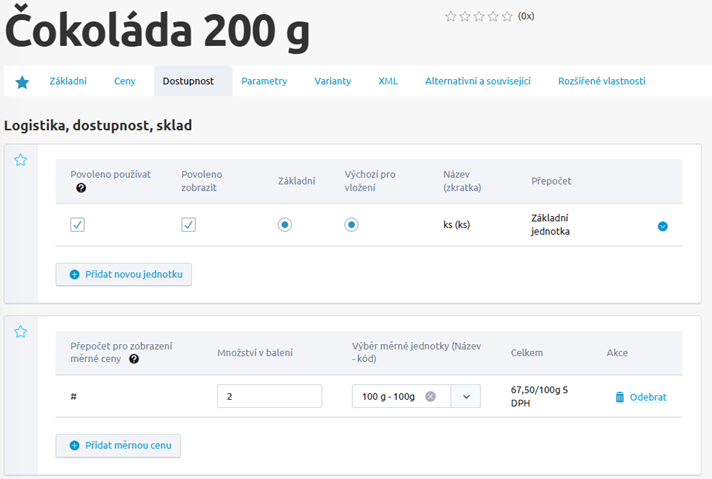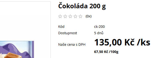 Príklad: Produkt „Čokoláda 200 g“ chcete zobraziť ako cenu za 100 g: