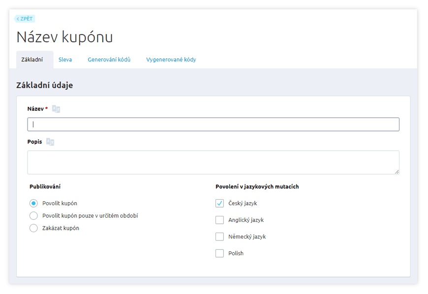 Slevové kupony je možné nastavit pro každou jazykovou mutaci samostatně. Dá se tedy vytvořit samostatně kód na základě jazykové mutace, respektive měny.
